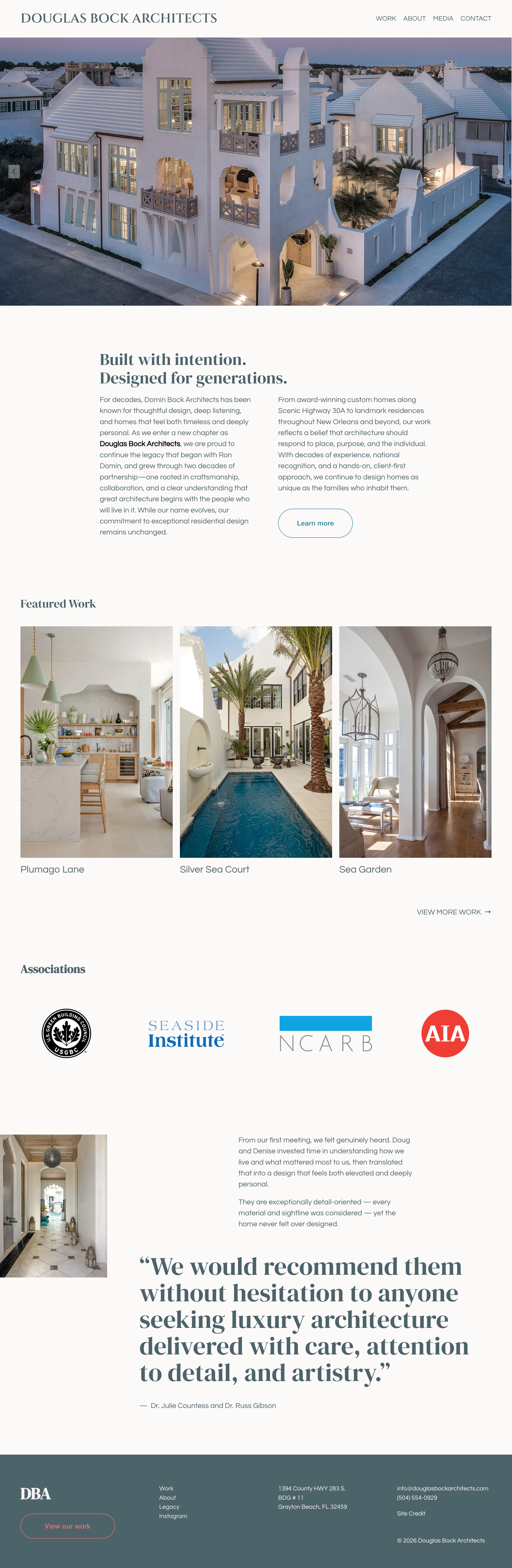 Douglas Bock Architects partnered with Caston to reimagine and relaunch their new site, creating a digital presence that reflects the firm’s legacy, craftsmanship, and leadership in luxury residential design. With an extensive portfolio spanning Florida’s Scenic 30A and historic New Orleans neighborhoods, the firm needed a website that would showcase the depth of their work while positioning them clearly as a premier architect in competitive coastal markets.